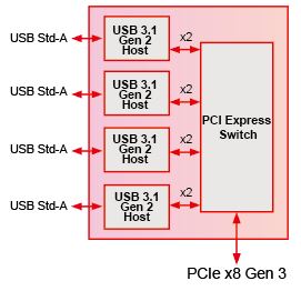 Quad Channel 4-port USB 3.1 Gen 2 (10Gbps) to PCI Express x8 Gen 3 Host Card